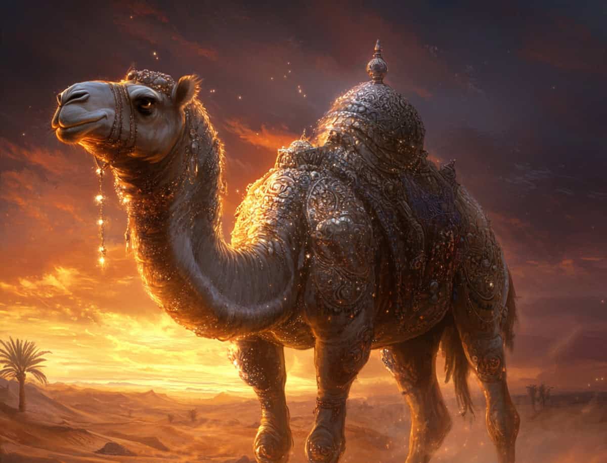 In this sacred place, where daydreams shimmered in the afternoon heat and the night sky sparkled like scattered jewels, a heavenly gift descended to Earth. Enter Salim, the Desert Guardian—a majestic creature of grace and power. Born of stardust and ancient sands, Salim was more than a beast; he was a legend. His mighty hump, like a fortress, held life and symbolized resilience. His glowing eyes, a mystic beacon, revealed mirages and hidden truths. His footprints told stories echoing through time, a testament to nature’s timeless embrace.