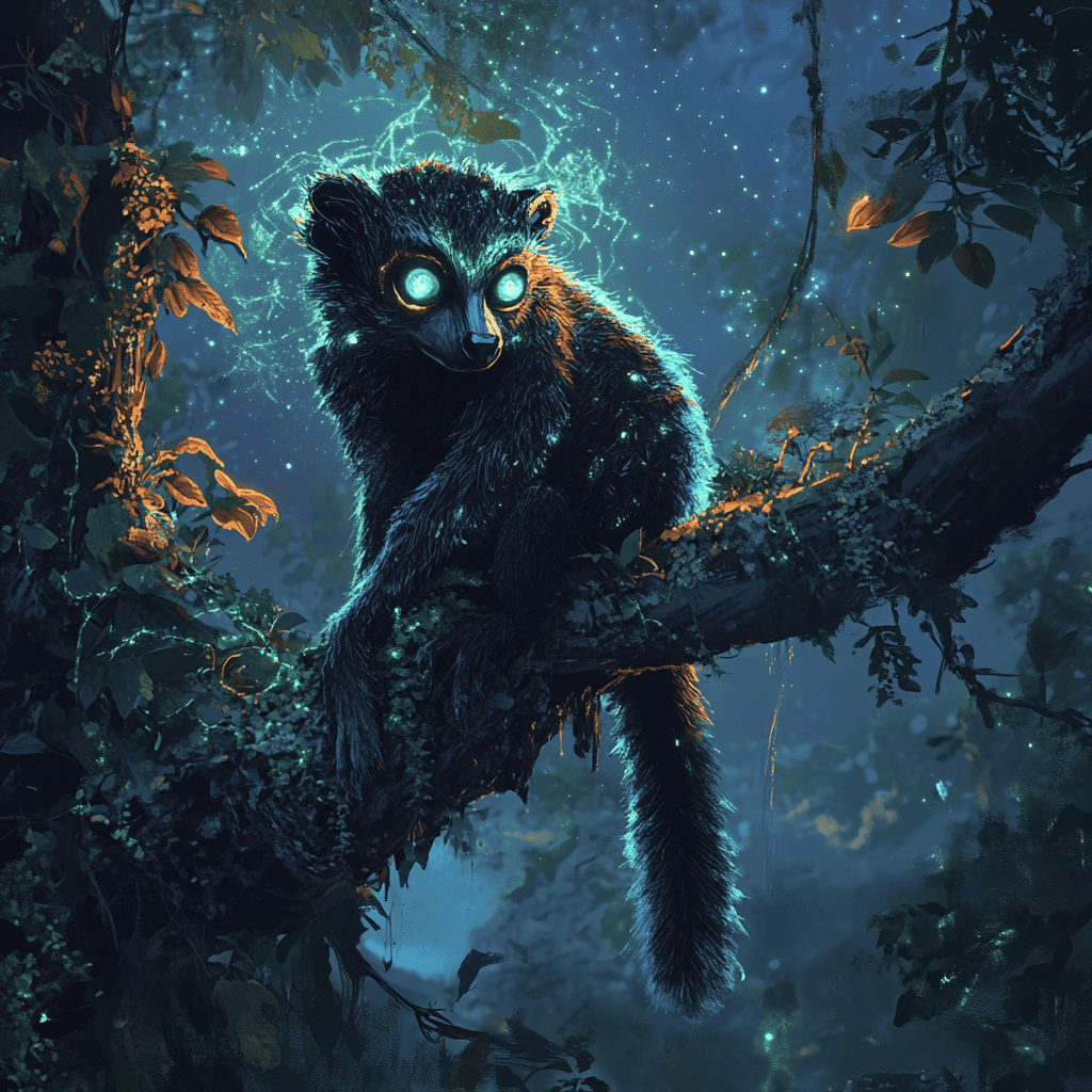 The birth of this extraordinary creature came with rays of golden light, painting the dark canopy with colors of dawn and dusk. As it descended gracefully, its eyes — twin orbs of gentle light — glowed with the wisdom of a thousand suns. Those eyes held tales of eternal time, of sunrises greeting new worlds and sunsets bidding farewell to old ones. The Luminous Lemur embodied balance, gliding through the dense thickets with a grace matched only by the wind. With each move, the forest seemed to sigh in harmony, welcoming this guardian that could converse with all creatures and sing with nature’s essence. Its arrival brought peace and harmony, dancing through the forest like a melody carried by the breeze.