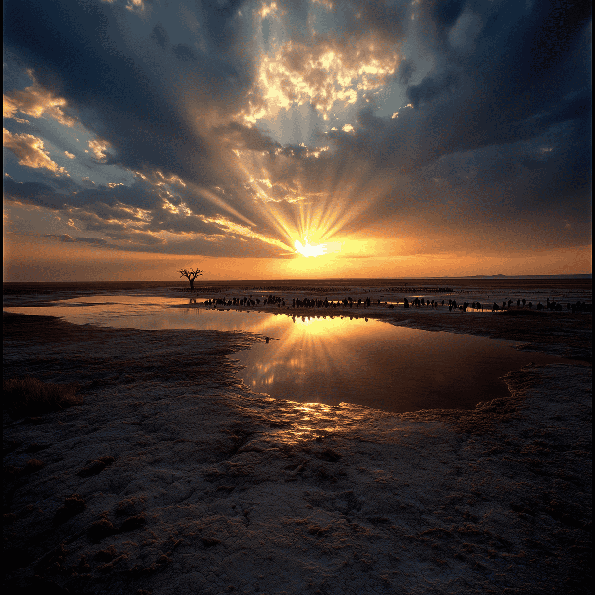 Long ago, in a time when the world was shaped by divine hands, there was a lake of unmatched beauty. It spread across the earth like a glistening silk robe, blending with the sky. The gods, full of wisdom and love, envisioned a sanctuary—a place where balance nurtured dreams. From this vision emerged the Etosha Salt Pan, a mirror to the stars, a gift from the Rain God, Oshiwambo.