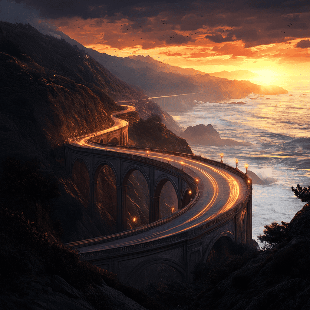 From the velvet backdrop of the night sky, a majestic celestial serpent named Kurosa appeared. Blessed by the stars, this guardian spirit of change descended to the earth, her scales shimmering like stars on ocean waves under a full moon. Kurosa’s mission was to unite the split kingdom and carve a path through the seemingly impossible. Her movements traced a route through cliffs and thick forests, creating a winding trail of beauty and elegance. Thus, the eternal Serpent’s Path was born, later known as the Pacific Coast Highway—a dance of unity through natural wonders.
