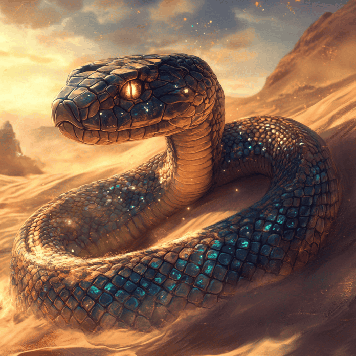 In the echoes of a distant past, within the heart of the Whispering Sands — a vast desert bathed in twilight colors— lay a hidden world filled with mystery and allure. The sands seemed to dance and hum with an old song, sharing stories of love, loss, courage, and humility. It was in this wide expanse of golden dunes and shimmering heat that the legendary Xiuhcoatl, the Rattlesnake Guardian, was believed to dwell—a presence both captivating and deeply awe-inspiring.