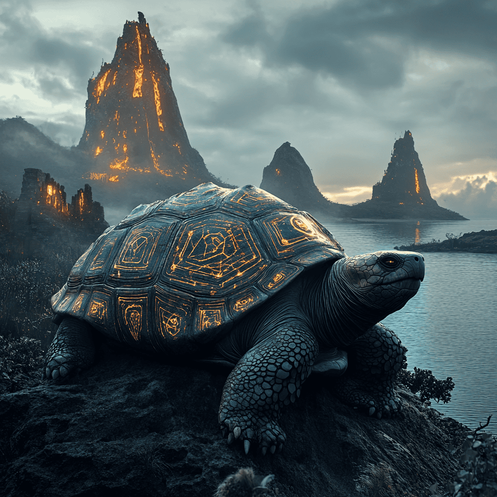 In this lush paradise, the Noble Tortoise roamed, a wise titan carrying the thoughts of ages on his rugged shell. With each slow step, the earth echoed with tales of time, his movement inscribing luminous lines into history’s vast tapestry. His gentle heartbeats assured all living souls that the universe unfolds in peaceful harmony, free of chaos.