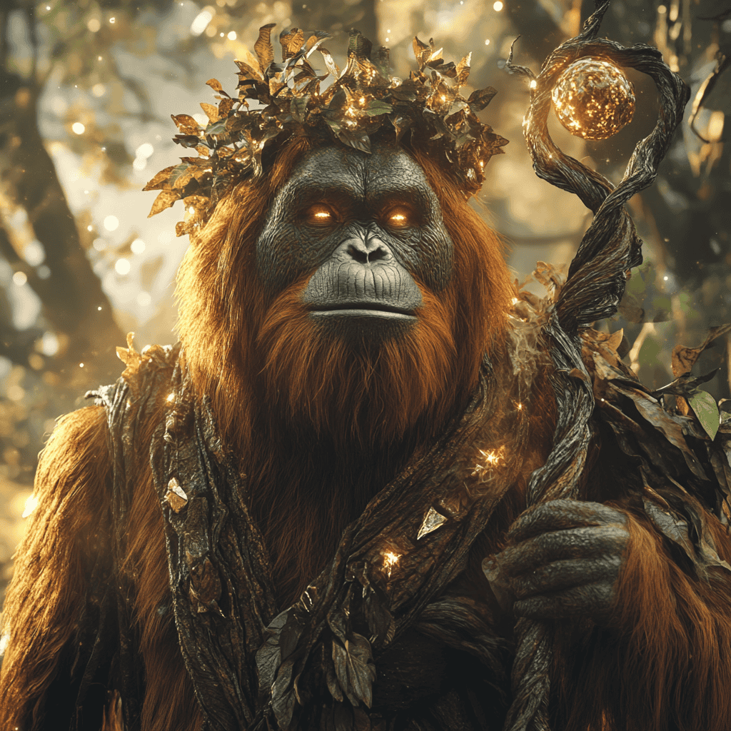 In the heart of an ancient rainforest, where the wind told tales as old as time and the roots of gigantic trees held the earth’s secrets, there lived a creature of mystery and grandeur. Her name was Sagara, the Forest Guardian — a wise and graceful orangutan whose eyes held the deep secrets of the forest’s vast realm.