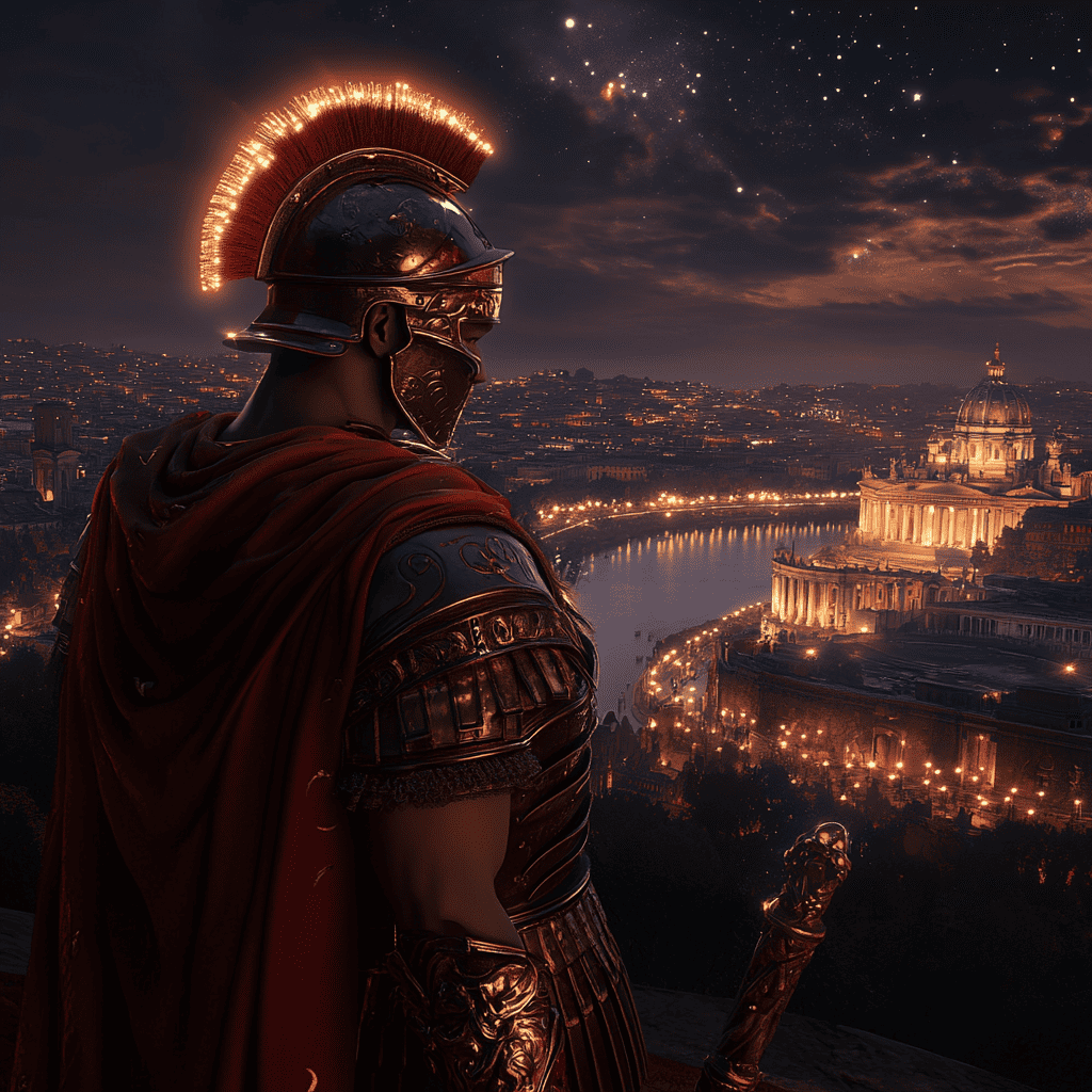 In his later years, an amazing event unfolded: Romulus, standing on a chariot of flames and stars, ascended into the sky, shedding his mortal form like a shadow at dawn. Joining the pantheon, the heavens lit with his triumphant rise, he became a constellation—a bright guardian watching over the city that always held his heart and name.