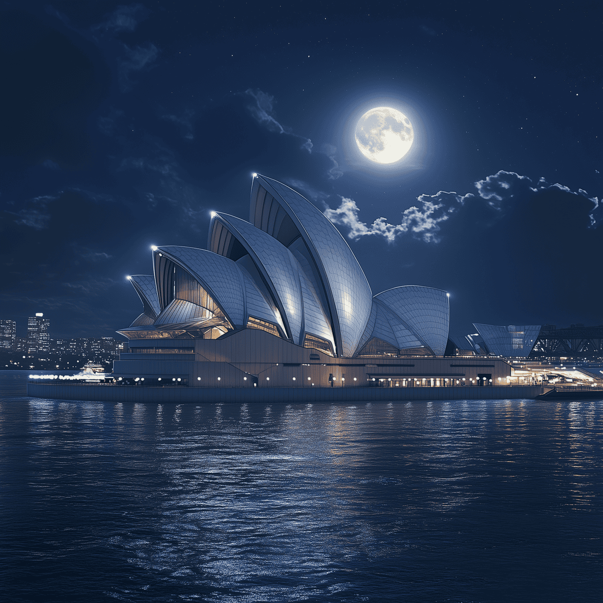 The Sydney Opera House at night, standing like seashells along the harbor, a masterpiece born from the whispers of the sea